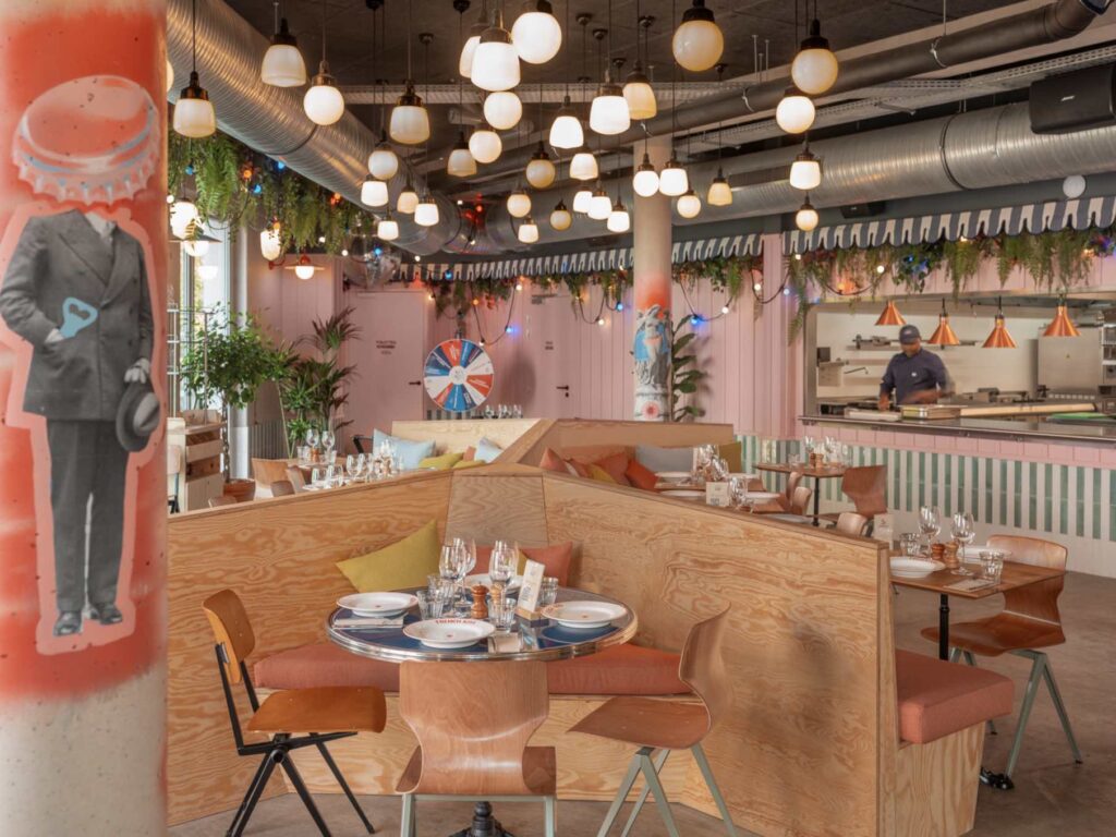 Côté design, Eklo reste fidèle au Studio Janreji qui signe l’identité architecturale du groupe depuis 2017. Au menu de French Kiss Nantes, un design intérieur coloré, joyeux et inspirant, une alliance subtile entre upcycling et créations sur mesure emblématiques du savoir-faire français. Des matières brutes durables et des textures raffinées, des touches modernes et des pièces chinées. L’aménagement intérieur est réalisé par des artisans français et le mobilier est sourcé auprès de fournisseurs engagés. Guirlandes et végétalisations intérieures se fondent dans une mise en scène inspirée pour créer l’esprit « guinguette ». Les « graphs’ » de l’artiste bordelaise Rebecca Bourbigot sont ponctués de clins d’œil au baiser français. Les fans de gaming se retrouveront devant la borne Arcade avec ses jeux vintage des années 80.